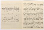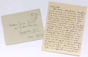 Stenay (Meuse) ». Belle lettre à sa femme pendant la guerre. « Mon amour – chère Janine – chère Janine aimée – excusez-moi. Je crois bien qu’hier je ne vous ai pas écrit. Je suis bien coupable n’est-ce pas. Et pourtant je pense tout le temps à vous. Mais je trouve mes lettres bien ridicules, mes récits bien sots. Constatations générales : combien il est facile de redevenir militaire, on s’y fait très vite. C’est assez étonnant. 2èmement : je trouvais Petitjean ridicule avec le tapage qu’il faisait autour de la “condition de la mobilisable”. Mais il est de fait que ce n’est pas ordinaire ; on voit des types qui après avoir terminé 2 ans de service en août dernier ont été rappelés 1 mois en septembre et rappelés de nouveau en mars sont à la caserne – ou en ligne – depuis ce temps-là. Et d’autres qui depuis 1 an ont été rappelés 4 fois. Sans compter des vieux de plus de 50 ans qui sont rappelés. 3èmement : c’est pas mal la pagaïe. Hier soir, on n’a eu qu’un morceau de viande (petit) et un ¼ de vin pour tout dîner. Dimanche, je suis allé me promener à Morzay, le long de la Meuse. Hier, tout le temps s’est passé à changer de chambrées, à s’habiller (on est de nouveau habillé, et faut voir comme), etc. On doit – on devait aller à Morzay (ou zet) hier soir ; nous n’y sommes pas partis ; on attend d’y partir. On ne fait rien – sinon, bénévolement, de balayer les chambrées (quels taudis c’étaient). La discipline aussi, quelle rigolade. Il est vrai que ça peut changer. Bref, tout ça c’est peu de chose. Ça m’amuse assez de me demander si j’entrerai en oct. à l’école Jolas. Si oui, j’ai bien fait de commencer à me préparer tôt. Si non, encore du “temps perdu” - si l’on perd son temps. Je vous aime mon amour […] Je vous aime, je vous aime »…
