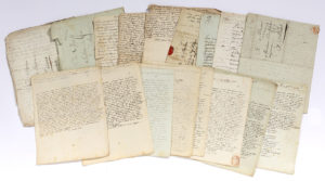 inédite du poète au dessinateur Desfriches. Aignan-Thomas DESFRICHES (1715-1800) était négociant, artiste et collectionneur. Robbé, originaire du Vendômois, fut un homme de son siècle, sympathisant des jansénistes. Sa correspondance est vivante, pleine d’anecdotes et de potins sur les célébrités et les événements du temps. La plupart des lettres sont millésimées, ou datées à leur réception, par Desfriches, qui en a parfois résumé en tête le contenu. Nous ne pouvons donner ici qu’un trop rapide aperçu de cette correspondance, restée inédite. 1770. Projet d’installation à Montargis… En mars, Robbé rend visite à Versailles à la comtesse du BARRY : après la « piteuse aventure » d’une première tentative, où il est éconduit à la suite d’une confusion, il est chaleureusement reçu par la comtesse, encore dans son lit… Le Roi de Prusse lui fait proposer 2.000 écus d’appointements et toute son indépendance… 1773. La duchesse d’OLONNE l’a couché sur son testament pour la somme de 40.000 livres ! 1774. Il travaille à sa Jobiade… Voyage en Allemagne avec M. de SAINTE-FOIX, ministre plénipotentiaire à la Cour palatine des Deux-Ponts… Nomination de MIROMESNIL comme Garde des Sceaux et Chancelier ; il espère que son ami Desfriches lui fera obtenir une place d’inspecteur de la Librairie… Décembre : souper chez le duc de CHARTRES, dans sa maison de Monceau, en « quadrille » avec le comte d’ARGENSON : « je fus d’une gaieté folle […] mes vers prirent avec une fureur dont il n’y a pas d’exemple, le duc, extasié, enthousiasmé, disoit continuellement qu’on ne s’attendoit pas a ces choses la. Il en a voulu retater, et l’orgie est fixée a dimanche prochain »... 1775. Mai : disette à Paris, pillage des boulangeries et des marchés, arrivée en ville de paysans vagabonds ; SARTINE est « logé a la Bastille » et l’abbé TERRAY au donjon de Vincennes ; Paris est envahi par la troupe… 1776. Longues lettres sur sa Satyre au comte de Bissy avec citations, ses corrections et additions, sa publication qui remporte un grand succès, avec un grand éloge par FRÉRON… Décembre : funérailles en grande pompe de la duchesse d’OLONNE. 1777. Grande gêne de Robbé, après qu’une attaque d’apoplexie eut laissé sa femme paralysée… Il va se remettre à sa Jobiade, et recopie son épître en vers à Mme Panelier… On joint une L.A. et une L.A.S. (s.d.), plus 8 lettres familiales ou amicales, la plupart à Desfriches, relatives à Robbé de Beauvezet, par Robbé de La Grange, l’abbé Pinel, Couturier, la comtesse de Moges, Trochereau de la Berlière (3), etc. ; plus qqs copies.