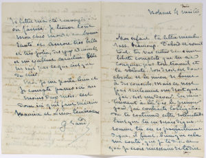 tout, tu vas entrer dans une liberté complète que tu as conquise par ton travail et ta volonté. Ton droit est donc absolu et le mien se borne à des conseils. Mais ce n’est pas seulement un droit que j’ai, c’est un devoir. En m’intéressant à toi dès le premier jour, j’ai contracté l’obligation de te continuer cette sollicitude tant que tu en seras digne, et comme tu en es parfaitement digne, il faut, bien que cela me coûte, que je te dise ce que je crois nécessaire de te dire. Ta santé exige plus de ménagements que tu ne parais le croire. Tu n’es pas pris, mais tu es menacé. Question de tempérament, qui rendra toujours assez grave un rhume ou un enrouement insignifiant chez un autre. Je suis presque sûre de ce que je te dis, et en mon âme et conscience, je t’avertis de deux choses. La première c’est qu’il ne faut pas te marier très jeune, la seconde c’est qu’il faut passer deux ou trois ans en Afrique ou dans le midi de l’Espagne ou de l’Italie. Tu es libre de jouer ta vie, de la faire, comme on dit, courte et bonne. Mais as-tu le droit de courir les chances d’un suicide ? Interroge ta conscience »… Correspondance, t. XX, n° 12686. On joint une émouvante L.A.S. « G. Sand », [Paris, 31 (?) décembre 1855], à Caroline LUGUET (1 p. in-12 sur papier bleu). « Ma chère Caroline, j’envoie à notre petite Marie la poupée favorite de ma pauvre Nini [sa petite-fille Jeanne Clesinger, morte le 13 janvier]. Ce n’est qu’à elle au monde que je la donne avec plaisir »… Correspondance, t. XIII, n° 6953..