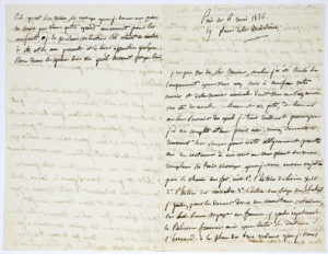 quels je tiens réellement parce que j’ai une complète estime pour eux ». Il renvoie cependant trois volumes qu’il souhaite changer : « Ce que je reproche aux trois que je ne prends pas, ce n’est pas le prix, ils sont incroyablement bon marché, c’est d’une part les dorures (celles de la tranche) qui, je le crains, paraîtraient trop magnifiques aux yeux des petits paysans auxquels je les destine ; secondement, le sujet : j’aimerais mieux au lieu de l’histoire telle qu’elle convient aux classes des collèges, quelque chose de plus approprié et de plus agréable : soit petites histoires instructives, soit livres ayant trait aux choses des champs. N’oublions pas qu’il s’agit d’une école primaire et d’enfants qui doivent presque tous être des cultivateurs et que je n’ai pas envie de pousser à être autre chose, désirant seulement les rendre plus éclairés et plus moraux dans leur condition. Vous devez avoir quelque chose qui réponde à ces idées car je crois que vous imprimez pour les établissements d’instruction publique de toutes les espèces des écoles élémentaires jusqu’aux écoles supérieures »… Il donne des nouvelles de leurs amis Ampère et Gustave de Beaumont... Il ajoute en post-scriptum : « Quand bien même les ouvrages que je donne en prix ne seraient pas d’un très grand amusement pour les enfants, je les prendrais volontiers s’ils étaient de nature à être utiles aux parents et à leur apprendre quelque chose dans le genre de vie qu’ils mènent presque tous. »