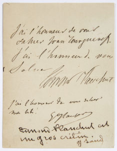 l’honneur de vous saluer Edmond Plauchut. J’ai l’honneur de vous saluer mon bibi ! Gve Flaubert. Edmond Plauchut est un gros crétin. G. Sand ». Ancienne collection Artine ARTINIAN (étiquette en p. 4).
