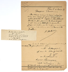 une certaine quantité de Sagesse et Parallèlement. Veuillez me faire parvenir la liste des gens à qui vous avez fait le service de presse »... Il demande d’envoyer un exemplaire à M. Triollet, et il donne son adresse à l’hôpital Broussais pour lui envoyer son courrier. On joint un sizain autographe (3,5 x 11 cm) : « Ou bien être un paladin / Gai, hautain »…