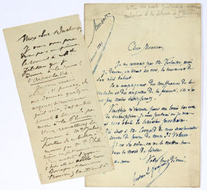 l’Art et la Vie. Je vous serais obligé, si pouvez, de me donner quelque argent, si minime qu’il soit, des autres sonnets envoyés par moi à la Plume. Vous remettriez la somme à Mlle Julie, porteur de ce billet à moins que Mlle Philomène ne soit venue munie d’un mot à l’avance (hier elle est allée rue Bonaparte pour vous trouver) l’autorisant à toucher s’il y a lieu. Je suis en affaires pour le livre sur la Hollande. Laissons donc dormir le projet de publication par souscription »… On joint une L.A.S. de Gustave LE VAVASSEUR, Amiens 17 janvier 1889 : « Je ne connais pas M. Verlaine, mais je devine en lisant ses vers, les tourments de son réel talent. En se compilant des souffrances de la maladie et des angoisses de la pauvreté, ils n’en sont pas moins intéressants »... (1 p. in-8).