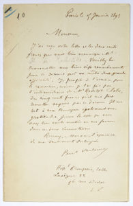 VERLAINE Paul (1844-1896). L.A.S. « Paul Verlaine », Paris 15 janvier 1893, [à E. LASSUDRIE] ; 1 page in-8 (une ligne grattée), cachet encre E. Lassudrie au verso. « J’ai reçu votre lettre et les deux cents francs que veut bien m’envoyer Mr...