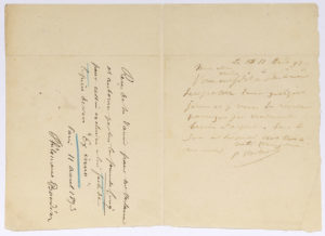 j’ai vraiment besoin d’argent. Sans le sou à l’hôpital c’est triste »… Sur l’autre feuillet, Philomène BOUDIN a signé le même jour ce reçu : « Reçu de Mr Vanier pour Mr Verlaine et autorisée par lui la somme de Cinq pour cession exclusive à lui faite de la pièce de vers “Ex inno” [Ex imo, poème mystique et profane où le poète dialogue avec Jésus, daté du 8 août et publié dans Le Figaro du 12, recueilli dans Poèmes divers].