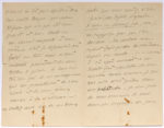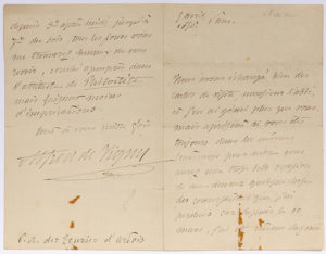 missions en Chine, en Tartarie et au Tibet, auxquels il avait consacré trois ouvrages.] Vigny, convalescent, prie l’abbé de venir le voir : « vous aurez une trop belle occasion de me donner quelque chose des conversations que j’ai perdues car depuis le 10 mars, j’ai été retenu chez moi d’abord au lit puis à présent sur une chaise longue par une blessure qui n’a pas été sans gravité et sans douleur. Un cheval emporté et une voiture d’où je descendais ont failli me tuer, mais se sont contentés pourtant de me tordre le pied. Je leur sais très bon gré de ces ménagemens qui me permettront de vous revoir et de vous dire comme à la Sultane : “contez-moi de ces beaux contes que vous contez si bien”. Je n’ai pas besoin d’ajouter : si vous ne dormez pas car je ne suppose pas que l’on dorme, la douleur m’en ayant fait perdre la coutume depuis un mois. En ce moment à 1 h. après minuit il me serait fort agréable de vous recevoir mais comme je sais que cela n’est guère dans vos habitudes, je vous prie de vous souvenir de moi dans vos voyages de jour depuis 3 h. après midi jusqu’à 7 h. du soir, tous les jours vous me trouverez, heureux de vous revoir, couché et surpris dans l’attitude de Philoctète mais faisant moins d’imprécations »...