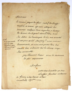 Jacques Du Four natif de Bresse emploié à Merin [Meyrin, près de Ferney] est venu attaquer lui troisieme madame Denis aujourd’huy à l’entrée de la nuit sur le grand chemin de Gex. Il a tiré son sabre. Les domestiques le lui ont arraché, il est pris et lié chez moy (nb : il n’a pas voulu nommer ses complices, mais il a avoué qu’il en avait). Nous vous en donnons avis, et nous vous prions tous de vouloir bien ordonner sur le champ ce qui sera convenable »…