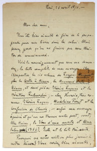 pour mes livres dans les salons. Mais prenez garde qu’on ne finisse par vous traiter de communard ». Et il dresse « la liste complète de mes ouvrages : chez Charpentier, les six volumes des Rougon-Macquart, plus les Contes à Ninon, les Nouveaux Contes à Ninon, et deux pièces Thérèse Raquin et les Héritiers Rabourdin ; – chez Lacroix, trois romans, Thérèse Raquin, Madeleine Férat et la Confession de Claude ; – enfin mes ouvrages épuisés et qu’on ne trouve nulle part, sont : Mes Haines, le Vœu d’une morte, et Mon Salon (1866). Telle est la liste très exacte. Pourquoi ne vous voit-on plus jamais à notre dîner ? Vous seriez bien aimable, un soir, de venir nous surprendre. Vous savez que vous êtes pour nous tous un bon souvenir »…