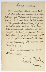 ZOLA Émile (1840-1902). L.A.S. « Emile Zola », Paris 21 mars 1902, à M. BLOCH ; 1 page in-8. Au sujet de son buste : « mon buste n’est plus entre mes mains. Le docteur GALIPPE, qui l’admirait beaucoup, me pressait de le lui céder. Je lui...