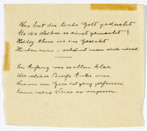 Weiber er einst gemacht? Heilig thun sie ins Gesicht Hintenrum schämt man sich nicht. » « Von Anfang was es allen klar, Wer solcher Briefe Autor war Nur wer von Gier is ganz zerfressen Kaum seine Würde so vergessen. » Traduction libre : À quoi pensait le bon Dieu lorsqu’il a créé les femmes, en leur donnant un visage de saintes, mais sans vergogne par derrière. / Dès le début, on n’avait aucun doute sur l’auteur de telles lettres ; seuls ceux qui sont ravagés par l’avidité peuvent à ce point oublier leur dignité. Einstein se délassait parfois de ses travaux scientifiques en écrivant de brefs poèmes, parfois au milieu de feuillets remplis de calculs. Ces deux quatrains épigrammatiques constituent un rare échantillon de cette activité poétique. D’après les archives Albert Einstein, qui possèdent également un autographe de ces textes, ils dateraient respectivement de 1932 et 1930. Le premier s’inscrit la longue tradition de la déploration de la duplicité féminine, que l’on peut faire remonter jusqu’au poète latin Martial et même avant. Le second quatrain, de tonalité plus grave, révèle un moraliste fustigeant l’hypocrisie et le manque de dignité humaine.