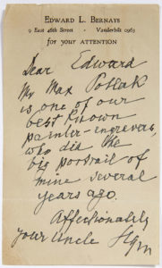 Edward Mr Max Pollak is one of our best known painter-engravers, who did the portrait of mine several years ago. Affectionately your uncle Sigm ». [Edward L. BERNAYS (1891-1995), neveu de Freud, par son père (dont la sœur épousa Freud) et sa mère (Anna Freud, sœur de Sigmund), fit une brillante carrière de publicitaire en Amérique ; on le considère comme le père de la propagande politique.]