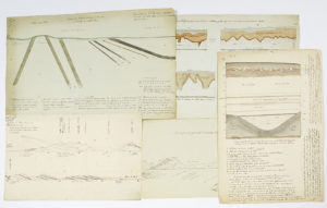 HISTOIRE NATURELLE. 53 DESSINS avec légendes et annotations manuscrites, 1798-1833 et s.d. ; formats divers, de 20,5 x 26,5 cm à 37 x 52 cm environ (quelques fentes et défauts). Important ensemble de dessins et notes sur la géologie, les fossiles...