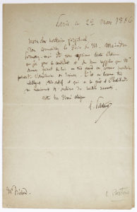 PASTEUR Louis (1822-1895). L.A.S., Paris 22 mars 1886, à Jules-Auguste BÉCLARD ; demi-page in-8. Il recommande à son collègue, secrétaire perpétuel de l’Académie de Médecine, la candidature d’Ernest MAINDRON (1838-1907), en lui rappelant...