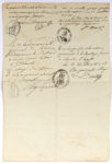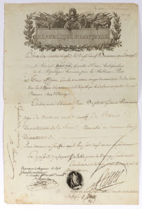 Général Brune, Conseiller d’Etat, Ambassadeur de la République Française près la Sublime Porte, grande vignette gravée, cachets encre. Beau passeport pour Jean Baptiste Gilliot RONCOURT, de Paris. Signé par le porteur, le document fut visé à Smyrne, Rhodes, Rosette, Corfou et Alexandrie (par DROVETTI).