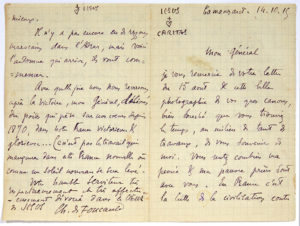 général de l’envoi de la photographie de ses gros canons : « Vous sentez combien ma pensée & ma pauvre prière sont avec vous. En France c’est la lutte de la civilisation contre la barbarie, de la liberté contre la tyrannie, de l’esprit chrétien contre l’esprit payen. À Constantinople, c’est tout cela & c’est de plus l’extinction d’une vieille honte, d’un état de chose honteux pour toute l’Europe. Comme si ses autres infamies ne suffisaient pas à l’Allemagne, elle leur a ajouté celle de se faire le soutien des Turcs. – Ce sera une grande date que celle de votre entrée à Constantinople, le début des temps nouveaux, d’une ère nouvelle. Que le bon Dieu vous y fasse entrer bientôt & qu’il vous donne bientôt la pleine victoire sur tous les fronts ! Ici, calme profond Les troubles de Tripolitaine, où nos amis les Italiens n’ont été ni heureux ni sages & ont payé leur inexpérience, n’ont pas passé la frontière ». Il évoque la nomination du lieutenant Paul Duclos dans sa région... « Il n’y a pas encore de rezzous marocains dans l’Adrar, mais voici l’automne qui arrive, ils vont commencer ». Il termine dans l’attente de la joie de se retrouver après la victoire, « délivrés du poids qui pèse sur nos cœurs depuis 1870, dans notre France victorieuse & glorieuse... ce n’est pas le travail qui manquera dans cette France nouvelle où comme un soleil nouveau se sera levé »…