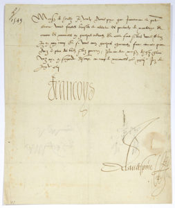 FRANÇOIS Ier (1494-1547). L.S. « Francoys », au camp de Maroilles 27 juin 1543, au bailli de Maubeuge ; contresignée par le secrétaire d’État Claude de L’AUBESPINE (1510-1567) ; 1 page in-4, adresse au dos. Il ordonne de faire « brusler &...