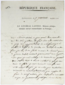 Portugal. Belle lettre comme ambassadeur au Portugal, irrité contre Bonaparte. [Nommé le 14 novembre 1801, Lannes arriva au Portugal le 25 mars 1802, et y resta en poste jusqu’au 10 août, puis du 12 mars 1803 au 1er août 1804.] « Nous sommes arrivés depuis avant hier, mon cher ami, tous bien portans. Il fait bien cher vivre dans ce pays, mes appointements ne sufiront pas à moitié, le loyer de la maison me coûtera dis mille francs par an, Il me faut au moins 150000 FF que le premier consul m’avait promis avant mon départ, sans quoi je suis obligé de demander au gouvernement mon rappel ; tout le monde s’atant ici que je vais donner des fêtes […] Je ne suis pas contant, on m’envoit un courier extraordinaire, pour négocier lafaire des vingt millions [l’indemnité de guerre imposée au Portugal par le traité de Madrid] ; j’ai réclamé à mon arrivée auprès du gouvernement portugais ; il se trouve que le premier terme a été négossié à Paris et payé. Je trouve sela bien mal, aussi je m’en plains au premier consul. Je vois, mon cher ami, que je ne pourrais pas rester longtems dans ce pays ; j’aime qu’on en agisse plus franchement avec moi [...] Commant se porte le petit Napoléon [son fils], il doit commancer à parler, il me tarde bien de le voir, nous embrassons tous les jours son portrait ». Il envoie du vin, à distribuer au Conul Cambacérès, au docteur Corvisart, au général Augereau, etc. « Nous avons été parfaitement bien reçus à notre arrivée les englais s’an sont même plains ; on prétant que pas un envoyé n’a été aussi bien reçu ; j’ai vu le premier ministre ; je vais être présanté après-demain au prince [le régent et futur roi Jean de Portugal] et Louise à la princesse. […] Je reçu la visite de tous les embassadeurs avant même que je les aye prévenus de mon arrivée. Il court un bruit ici que les hostilités ont recomancé avec les Englais. Je pense que si cela était j’en serai instruit ; je n’en crois rien, au reste tan pi pour eux »...