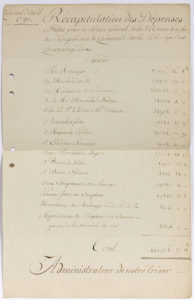 faites pour le service général de la Maison bouche du Roi » pour le quartier d’avril (2e trimestre) 1790. Dépenses des frais de bouche du Roi se montant à 445.924 livres 17 sols 11 deniers : boulanger, marchand de vin, fruitier, crémier, épiciers, charcutier, etc.