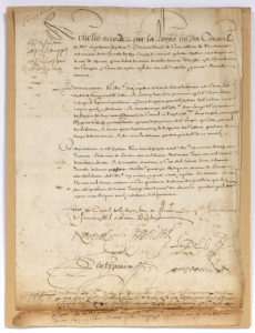 lignes). ; portrait joint. « Articles accordez par la Royne en son Conseil », concernant la vente à Antoine FEYDEAU de cent offices de secrétaire ordinaire de la Chambre du Roi, aux gages de 400 livres chacun à « ses risques perils et fortunes ». Ces offices sont nouvellement créés « moiennant ce le dict Feydeau sera tenu de payer a sa dicte Majesté es mains de son trésorier la somme de quatre cens mil livres, assavoir trois cent mil livres dans trois jours, et le surplus montant à cinq mil livres dans le dernier decembre de l’annee presente 1614 »... Le document est signé deux fois par CONCINI et par les conseillers Nicolas POTIER, Jehan PHELYPEAUX, Louis DOLL, avant d’être approuvé et signé par la Reine.