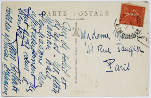 Sainte-Maxime, Mermoz a écrit, à l’encre bleue, à sa mère (dont il a noté l’adresse) : « Cure de soleil et de repos. Ma petite Maman nous t’embrassons bien affectueusement de tout notre cœur à bientôt Jean Hôtel des Mimosas Ste Maxime » ; sa femme Gilberte a signé à ses côtés. Provenance : vente Mermoz, Artcurial, 11 octobre 2008 (M72).
