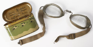[MERMOZ Jean (1901-1936)]. LUNETTES D’AVIATION ; environ 5 x 17 cm, verre, cuir, métal et ruban élastique, dans leur boitier d’origine. Ces lunettes sont conservées dans une boîte métallique peinte marquée Occhiale Sport, de La Cigogna à...