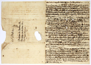 lettre à sa femme, alors que Mirabeau est en pleins démêlés judiciaires, quelques semaines avant sa condamnation et son enfermement au Château d’If. « Je ne sçavois pas, ma belle dame, ne devoir venir qu’à ton quatrième tour ; et sans reproche je t’ai souvent mieux traité… Cette mauvaise plaisanterie t’apprendra que j’ai reçu ta lettre de Lyon, et grand bien elle me fait. Tu n’y as pas été bien vite, et tant mieux car tu auras été moins fatiguée ; mais, soit dit entre nous, et pour la dernière fois, tu ne devois pas t’arrêter à Tain (?), entre tous les lieux du Languedoc, c’étoit le dernier à choisir passons. Ton fils va toujours bien et son intelligence a singulièrement gagné. C’est une grande fête ici que de le voir dimanche en robbe. Soit. Je ne me suis mélé de rien de tout cela, que du changement d’habit de peur de refroidissement. Il a percé encore une dent ». Il a reçu un courrier de Grasse. M. de Tourettes « a été étonné de la fripponerie et de la sottise combinées de M. Albanesi juge subrogé. Il ne conçoit pas comment il a osé décréter de prise de corps, et nous espérons avoir matière à prise à partie. […] Dans le cas de l’appel il me recommande de conjurer mon père d’appeller lui-même, comme ayant mes actions. Pour moi soit qu’on appelle, soit qu’on n’appelle pas, histoire de forme judiciaire, dont je ne mêle ni m’embarrasse, voici mon opinion, mon vœu et mon désir. Que mon père daigne m’envoyer mon rappel, qu’il obtiendra sitôt qu’il le desirera, je lui jure que je ne m’en servirai que comme il voudra. Qu’il m’abandonne à la discussion criminelle pour me donner le droit après ma justification publique de poursuivre à toute outrance M. de Moans comme ayant voulu déshonorer son fils par une calomnie avérée et infamante, tu ne doutes pas que je ne pelote un peu les témoins quand nous en serons aux confrontations. Quand il sera bien constant que M. de Moans est un infâme calomniateur, que ma famille daigne se réunir pour en demander justice, et le dit Sieur verra beau jeu ». Sa femme étant son « représentant naturel », il demande à genoux que ses parents « sollicitent le ministre de ne point consentir à l’exécution du décret et […] qu’ils ne feront pas commuer les ordres qui me retiennent à Manosque en d’autres plus rigoureux et qui m’éloigneroient davantage encore de mes affaires. M. de Moans a fait la fanfaronnade d’envoyer à Mirabeau deux cavaliers de maréchaussée et un huissier qui laissèrent la copie du décret et un exploit de perquisitions, cela n’a pas de sens commun, mais rira bien qui rira le dernier ». Il n’acceptera qu’un accommodement : « Que M. de Moans devant le commandant de la province – M.M. de Sabran, de Castellane et de Pontevès, et M. de Marignane au nom de ma famille et représentant la sienne me fassent des réparations et un désaveu formel signé d’eux tous comme témoins. Si cela lui dit, il peut y toper. Allons ma belle, de l’activité, du courage et tout ira bien »...