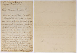 N’ayant point reçu de lettre de Holande depui celle que ma mère vous a remis dans la quel on nou dit de prendre patiance je vient vous demandé votre bonne volonté pour terminé s’est afaire car je ne travaill pa depuis 1 mois. Dans l’espoir que vous ne moublieré pa sitot qu’ils aurons répondu a votre lettre je vous la ferai parvenire. Je souhaite que la présente vous trouve plain de santé ainssi que votre dame ma mère vous envoi le bonjour inssi qua votre dame »… On joint une reproduction photographique ancienne d’une autre lettre au même.