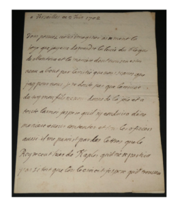En pleine guerre de succession d’Espagne, le Grand Dauphin, évoque l’arrivée de son fils Philippe V d’Espagne et petit-fils de Louis XIV. Le duc de Vendôme commande alors les troupes françaises en Italie et vient de battre, le 15 avril 1702, le prince Eugène de Savoie à Luzzara. «Vous pouvez vous imaginer aisement la joye que jay eue d'aprendre la levée du bloqus de Mantoue et la manière dont vous en estes venu à bout, par l'amitié que vous scavez que j'ay pour vous. Je ne doute pas que l'arrivée du roy mon fils ne vous donne de la joye et à toute l'armée jespere quil sy conduira dune manière a nous contenter et tous les oficiers aussi, il me paroist par les lettres que le Roy receut hier de Naples quil ne se partira pas si fort que lon le croit jespere quil trouvera les affaires les affaires en bon train en vous joignant. Comme le courrier va partir tout à l’heureje finis en vous asseurant que personne ne vous aime ny ne vous estime plus que moy. La Reyne du Boysdoré vous asseure de ses respects Louis ».