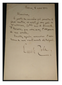 En 1889, Émile Zola s’était installé au 21bis, rue de Bruxelles. Cette lettre témoigne de ses derniers allers-retours entre Paris et Médan et du suivi des livraisons de L’Aurore, son départ de Médan vers la rue de Bruxelles en avril 1902. Quelques semaines plus tard, l’écrivain meurt asphyxié par accident, ou malveillance, le 29 septembre 1902 à son retour à Paris. Alors que Le Figaro venait de refuser ses derniers articles, Zola s’était tourné fin 1897 vers L’Aurore, fondé la même année par Ernest Vaughan, dont le positionnement était moins conservateur. Émile Zola y publie en janvier 1898 son célèbre article « J’accuse… ! », titre inspiré par son éditorialiste Georges Clemenceau et qui marque le début de l’affaire Dreyfus.