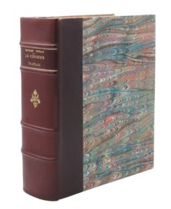 Paris, Émile-Paul Frères, 1934. Grand in-8, demi-chagrin brun, dos à nerfs, exemplaire à grandes marges non rognées (Reliure moderne).Édition originale de ce recueil rare et recherché des meilleures recettes d'autrefois et d'aujourd'hui, présentant l'histoire des livres de cuisine, de nombreuses anecdotes sur le vin, et 1 200 recettes de cuisine française ancienne et moderne, suivies d'une importante bibliographie.