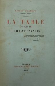 TENDRET (Lucien). La Table au pays de Brillat-Savarin. Belley, Louis Bailly fils, 1892. In-8, broché, chemise et étui de percaline verte, pièce de titre basane rouge (Reliure moderne). Oberlé, 256. Édition originale, rare. L'auteur était avocat à Belley, la ville où naquit Brillat-Savarin. Cet ouvrage offre à découvrir toutes les richesses de cette région.