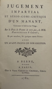 [PARMENTIER (Antoine-Augustin)] — Jugement impartial et sério-comi-critique d'un manant, cultivateur & bailli de son village, sur le pain de pomme de terre pur de MM. Parmentier & Cadet ; et par occasion, sur quelques autres points : avec un avant-propos de son greffier.