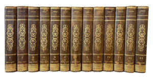 Paris, Deterville, 1809. 13 volumes in-8, demi-basane brune, dos lisse orné en long, tranches mouchetées (Reliure de l'époque).Réédition de cet ouvrage dû à l'abbé François Rozier (1734-1793), professeur à l'École vétérinaire créée par Bourgelat, fondateur du jardin botanique à Lyon, directeur dès 1771 de la revue scientifique Observations sur la Physique, l'Histoire naturelle et sur les Arts et Métiers pendant 10 ans à Paris, collecteur européen de variétés botaniques, etc. C'est à Lyon, où il ouvrit une école d'agriculture, qu'il écrivit les neuf premiers tomes de son Cours d'agriculture, publié de façon posthume en 1796 et continué par ses collaborateurs.
