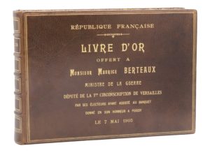 BANQUET RÉPUBLICAIN — Livre d'Or offert à Monsieur Maurice Berteaux Ministre de la guerre Député de la 1ère circonscription de Versailles, par ses électeurs ayant assisté au banquet donné en son honneur à Poissy le 7 mai 1905.