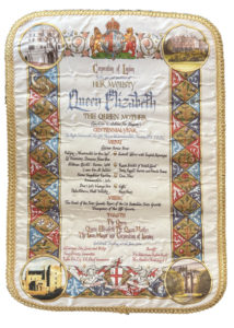 Menu dans son boîtier du déjeuner pour la célébration du centenaire la Reine-mère, servi à Guildhall, le mardi 27 juin 2000. Menu sur soie d'environ 29 x 41 cm., présenté dans sa boite de velours bordeaux.