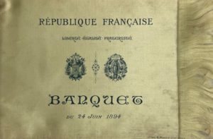 [MENU]. CARNOT — Menu du banquet offert au Président Sadi CARNOT par le Conseil municipal de Lyon et Conseil général du Rhône le 24 juin 1894 à l'occasion de l'Exposition universelle, internationale & coloniale de Lyon.