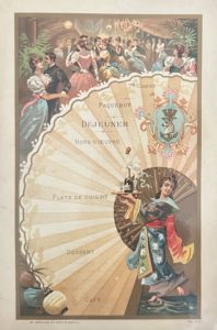 1880-1899. 23,5 x 15,5 cm. Belle collection de menus, la plupart par Vimar, en chromolithographie, destinés aux Premières Classes sur les paquebots des Messageries Maritimes, menus vierges : 2 Lunch, 15 Déjeuner, 9 Diner
