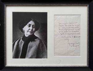 Le reçu est encadré à droite d'un tirage recadré du portrait photographique de George Sand par Nadar.