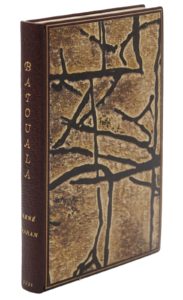 Paris, Albin Michel, 1921. In-12, demi-maroquin brun, plats recouverts de papier imprimé, dos lisse, tête dorée, couverture et dos (Devauchelle).Édition originale de cette "suite d'eaux-fortes" africaines, avec son importante préface dénonçant les errements de certains administrateurs en Oubangui-Chari.