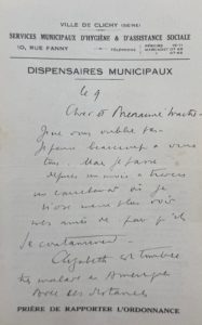 -Lettre à en-tête des dispensaires municipaux de la ville de Clichy. "Cher et bien aimé maître. Je passe depuis un mois à travers un cauchemar où je n'ose même plus voir mes amis de peur qu'ils se contaminent; Elizabeth est tombée très malade en Amérique; Avec ces substances il n'est possible d'imaginer que des horreurs".