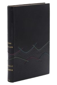 Paris, Gallimard, 1935. In-12, maroquin noir, plats ornés d'une composition mosaïquée de cuir à l'imitation de peau de serpent, listels de maroquin violet, turquoise et vert, dos lisse orné de même, tranches dorées, couverture et dos, chemise et étui (C. Léonard).Édition originale.
