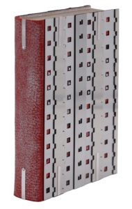 Paris, Gallimard, 1959. In-12, plats rapportés en polymère imitation acier perforés laissant apparaître le papier imprimé, ornés de trois bandes verticales aux bords crénelés du même polymère cotrecollées en relief, dos lisse de maroquin rouge patiné argent orné de deux pièces en métal, doublure bord à bord en papier argenté, gardes de daim rouge, tête argentée, couverture et dos, chemise de daim gris pailleté portant une pièce de titre de maroquin rouge, étui (F. Rousseau 2014).Édition originale.