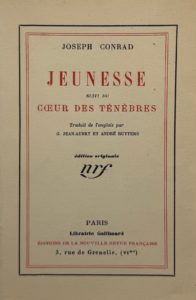 Jeunesse, suivi du Cœur des ténèbres. Paris, Gallimard, 1925. In-8, broché, non rogné. Édition originale de la traduction française, due à G. Jean-Aubry et André Ruyters. Un des 943 exemplaires sur papier vélin pur fil Lafuma-Navarre.