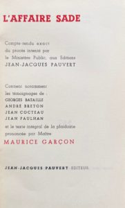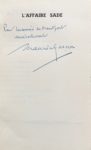 GARÇON (Maurice), Georges BATAILLE, André BRETON, Jean COCTEAU et Jean PAULHAN. L'Affaire Sade. Compte-rendu exact du procès intenté par le Ministère Public, aux Éditions Jean-Jacques Pauvert. Paris, Jean-Jacques Pauvert, [1957]. In-12, demi-maroquin prune avec coins, dos lisse, couverture (Reliure de l'époque). Édition originale tirée à 1000 exemplaires numérotés. Enrichi d'un envoi autographe de Maurice Garçon.