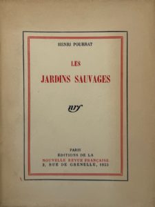 Les Jardins sauvages. Paris, NRF, 1923. In-8, broché. Un des 100 exemplaires de tête sur papier vergé pur fil réservés aux bibliophiles de la Nouvelle Revue Française. Dos passé, couverture légèrement jaunie.