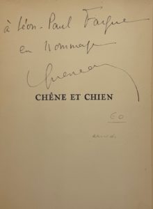 Chêne et chien. Paris, Les Éditions Denoël, 1937. In-12, broché, emboîtage (P. Goy & C. Vilaine). Édition originale illustrée d'un frontispice de Hélion. Exemplaire non numéroté du service de presse, enrichi d'un envoi autographe signé de l'auteur à Léon-Paul Fargue.