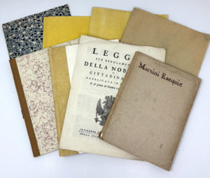 Testi a stampa. 8 opuscoli, tutti in ottime condizioni. Dimensioni 180/200x240/260 mm circa. (8) La raccolta comprende: 1) Lezione di Domenico Maria Manni accademico apatista sopra l'emendare alcuni luoghi delle vite di S. Filippo Neri [...]. Firenze, Viviani, 1760 (brossura coeva in carta decorata) – 2) Domenicae a Paradiso Florentinae Sanctissimae Crucis Monialium fundatrici optimae. Oratio coram Sanctiss. D.N. Papa Urbano VIII [...] habita à Iulio Cincio Romano [...]. Firenze, Sermantelli, 1631 (cornice xilografica con simboli medicei al frontespizio, legatura cartonata moderna) – 3) Delle lodi dell'altezza reale del Serenissimo Gio. Gastone VII Granduca di Toscana dell'Abate Giuseppe Buondelmonti [...]. Firenze, Paperini, 1740 (stemma xilografico al frontespizio, legatura cartonata moderna) – 4) Memorie della fiorentina famosa Accademia degli Alterati raccolte da Domenico Maria Manni [...]. Firenze, Stecchi, 1748 (brossura moderna) – 5) Iscrizioni pel solenne funerale di sua maestà il re Lodovico Primo [...]. Firenze, stamperia reale, 1803 (brossura moderna) – 6) Legge per regolamento della nobiltà e cittadinanza [...]. Firenze, stamperia imperiale, 1750 (61 articoli postillati, seguiti da una Istruzione alli Deputati sopra la Descrizione della nobiltà del Gran-Ducato di Toscana [...]; stemma xilografico al titolo, senza legatura) – 7) Esequie dell'altezza reale del Serenissimo Giovan Gastone Gran duca di Toscana fatte celebrare da [...] Francesco III [...] descritte da Bindo Simone Peruzzi. Firenze, stamperia di S.A. Reale, 1737 (legatura cartonata coeva) – 8) Delle tessere cavalleresche di bronzo tenute al collo. Lezione del sig. Domenico M.a Manni [...]. Firenze, Viviani, 1760 (numerose piccole immagini xilografiche delle tessere, brossura moderna).