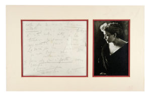 Manoscritto a matita nera, 1 carta filigranata, scritta recto (in orizzontale) e verso (in verticale), con varie sottolineature. Conservata in passe-partout cartonato insieme ad una riproduzione fotografica in b/n della diva. Dimensioni lettera 190x245 mm. (1) Cara, la Porziuncola è tutta disfatta, e ho demolito tutto dovendo andarmene – meno le belle rose che resteranno nel giardino. Ho raccolto in un baule che le mando cose, (non per lei) ma forse le saranno utili per qualcuna delle persone che lei conosce [...] le cose che le mando hanno vissuto, ma ahimé, tutto è vita nella vita [...] Spero che Lei è forte, come sempre – e come sempre io sono sua. E. D. La Duse abbandonò la villa della Porziuncola di Settignano alla fine della sua tormentata relazione con Gabriele d'Annunzio, che l'aveva lasciata per la giovane Alessandra di Rudinì. In questa lettera traspare tutto lo sconforto della diva per il tradimento del Vate.