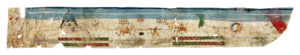 Striscia pergamenacea con raffigurazioni e decorazioni policrome. Alcuni strappi e segni del tempo; al bordo superiore è presente una velatura a tempera azzurra, successiva. Al verso, restauro conservativo cartaceo recente. Dimensioni 1000x150 mm. (1) Sulla pergamena sono raffigurati il Barbarossa (Khayr ad-Dīn) sotto una tenda, 5 cittadelle fortificate (una su una montagna rossa potrebbe essere Ait-Ben-Haddou), due elefanti con in groppa un castello (probabilmente per indicare elefanti da guerra), una zona acquarellata in verde (forse un'oasi), un cammello con cammelliere e, in due tondi, il bellissimo viso di profilo di Sayyida al-Hurra (il colore del tondo presente sulla sinistra è sbiadito). Al centro, è presente una sorta di rosa dei venti circondata da 32 raggi rossi e verdi che si allungano su tutta la cartina, attraversata ai lati anche da altre irraggiature. Si leggono alcuni nomi di località, non in arabo o in berbero: (probabilmente) Amaramat, Tafilalet (qui indicata Tafilet), Aurata, Loulad (qui Lauda), Litiba. Questa affascinante pergamena rievoca l'alleanza, in funzione antispagnola, tra la sultana Sayyida al-Hurra, una delle donne più straordinarie della storia marocchina, e Khayr al-Dīn (Barbarossa), il più grande corsaro della storia ottomana.