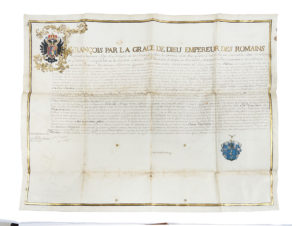Manoscritto pergamenaceo a inchiostro bruno con intestazione François par la grace de Dieu Empereur des Romains con lettere decorate in oro. Testo in francese in cornice dorata. Firma autografa di Francesco I. Stemma imperiale asburgico decorato in oro in alto a sinistra della pergamena e altra miniatura al margine inferiore sinistro. Alcuni fori al margine inferiore dentro i quali passava lo spago al quale era legato il sigillo. Dimensioni: 630x800 mm. (1)